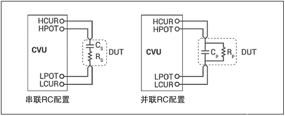 DUT测量的典型模型通常是一条串联或并联 电阻 电容(RC)电路。如图3中简化的模型所示,CVU既可以作为串联配置( RS CS)测量DUT,也可以作为并联配置(RPCP)测量DUT。