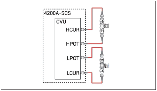 随机自带的附件可以通过BNC或SMA连接,来连接测试夹具或探头。图6显示了CVU以及为2线传感配置的随机自带的附件。CS-1247SMA到BNC转接头连接到每条CA-447ASMA到SMA电缆。HCUR和HPOT端子通过CS-701ABNCT形装置连接,构成CVH;LCUR和LPOT连接在一起,构成CVL。使用随机自带的扭矩扳手,紧固SMA电缆连接,确保接触良好。红色SMA电缆为100Ω。并联的两条100Ω电缆是50Ω,这是高频源测量应用的标准配置。