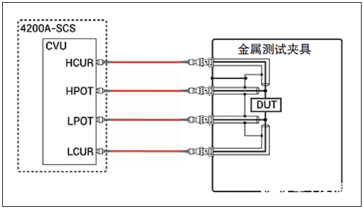 图7是DUT4线传感实例。在本例中,HCUR和HPOT端子连接到器件的一端,LPOT和LCUR端子连接到器件的另一端。为了改善带宽,我们把同轴电缆的外部屏蔽层连接到金属测试夹具上。我们使用到器件的4线连接,通过尽可能靠近器件传感电压,来简化灵敏的测量。