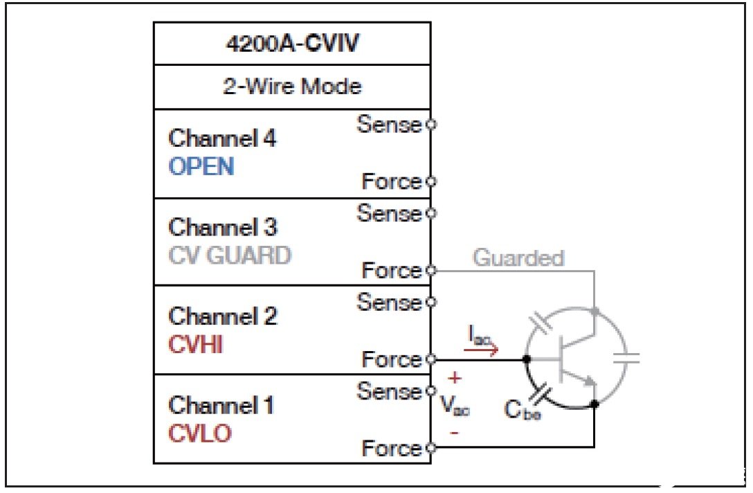 图10显示了把CVU的CVHI端子、CVLO端子和CVGuard端子通过4200A-CVIV的输出连接到BJT的三个端子上。在这个实例中,CVGuard通过4200A-CVIV的通道3切换到BJT的集电极端子上,这样就可以测量CVHI和CVLO之间的基极发射器电容。