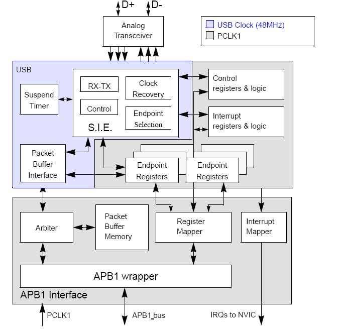 APB1封装:此部件为缓冲区和寄存器提供了到APB1的接口,并将整个usb模块映射到APB1地址空间。