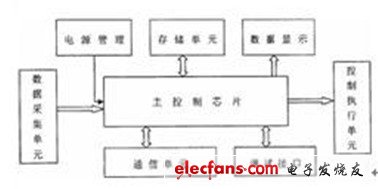 由于该节能装置需检测的模拟量较多,如储气罐内的压力、制动踏板的位置、车速、活塞运行位置和油门踏板位置等数据,而且有些是需实时监控的,如储气罐内的压力等,需要使用多任务执行方可实现,而普通单片机无法满足这一要求。因此需根据实际情况,选用合适的处理器芯片,加上各种数据和程序存储芯片构成最小系统。同时,增加数据采集、显示、通信接口、控制执行单元和电源管理模块等,来组成一个完整的控制系统。由于目前汽车应用CAN现场总线比较广泛,因此,为了与汽车的控制系统连接的方便,还增加了CAN总线接口,由此构成了整个硬件系统。系统的总体框图如图1所示。