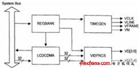 由于不同尺寸的LCD具有不同数量的垂直和水平象素、数据接口、数据宽度、接口时间和刷新率,S3C44BOX中的LCD控制器可以对相应的寄存器值进行编程,以适应不同的LCD显示板。LCD控制器逻辑框图如下图4所示。