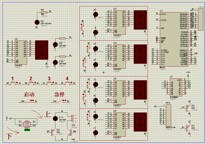 #include #define u8 unsigned char unsigned char seg_table[]={0x3f,0x06,0x5b,0x4f,0x66,0x6d,0x7d,0x07,0x7f,0x6f,0x00}; unsigned char run,floor; bit ud,stop=0; sbit P06=P0^6; sbit P07=P0^7; sbit ulc=P2^0; sbit dlc=P2^1; sbit start=P2^2; sbit alrl=P2^3; sbit alrb=P2^4; void input() { run|=((~P0)&0x3f); if((P06==0)&&(ud==1)) run|=0x02; if((P06==0)&&(ud==0)) run|=0x04; if((P07==0)&&(ud==1)) run|=0x08; if((P07==0)&&(ud==0)) run|=0x10; } void delay(int j) { int i; for(;j>0;j--) { input(); for(i=200;i>0;i--) { if(stop==1) break; } if(stop==1) break; } } void StepMotor(bit a,u8 b) { u8 x=0x80,i; if(a==1) { ulc=0; dlc=1; for(i=0;i { if(x==0x10) x=0x80; else x=x/2; P3|=(x&0xf0); delay(100); } } else { ulc=1; dlc=0; for(i=0;i { if(x==0x80) x=0x10; else x=x*2; P3|=(x&0xf0); delay(100); } } } void alarm() { alrl=0; while(1) { alrb = ~alrb; delay(200); } } void main() { floor=1; P1=seg_table[floor]; P0=0xff; ud=1; run=0; ulc=1; dlc=1; alrl=1; alrb=1; TCON=0x01; //打开外部中断0,并设置为下降沿触发 IE=0x81; //开总中断 while(1) { while(start==1) { P1=seg_table[10]; ulc=1; dlc=1; } input(); switch(floor) { case 1: //1 { P1=seg_table[floor]; if((run&0x01)==0x01) { delay(600); run&=0xfe; } if((run&0x3e)!=0) { StepMotor(1,5); floor=2; ud=1; } else { ulc=1; dlc=1; } } break; case 2: { P1=seg_table[floor]; if(ud==1) //2上 { if((run&0x02)==0x02) { delay(600); run&=0xfd; } if((run&0x38)!=0) { StepMotor(1,5); floor=3; } else { ud=0; ulc=1; dlc=1; } } else //2下 { if((run&0x04)==0x04) { delay(600); run&=0xfb; } if((run&0x01)!=0) { StepMotor(0,5); floor=1; } else { ud=1;