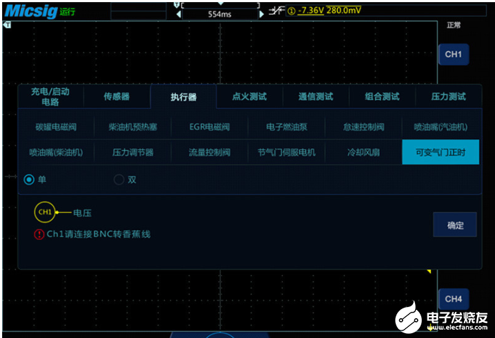 首先给示波器的通道一连接一根BCN转香蕉头线,红色香蕉头连接一根刺针刺入可变正时调节器的插头,黑色香蕉头连接一个鳄鱼夹搭铁接地。设置示波器通道一的通道衰减比为1X,垂直档位设置为5V/div,时基先设置为1ms左右,到时候再根据波形调整。