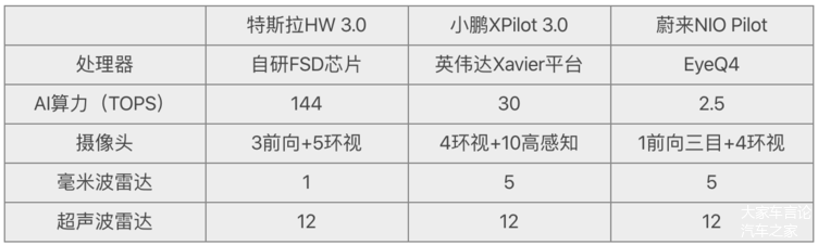 我以表格的形式,简单列出了特斯拉、小鹏和蔚来ADAS系统的一些主要硬件情况。从传感器的绝对的数量上看,小鹏P7是最多的,总数比特斯拉多出10个,从芯片算力上看,特斯拉是小鹏的4倍有余。