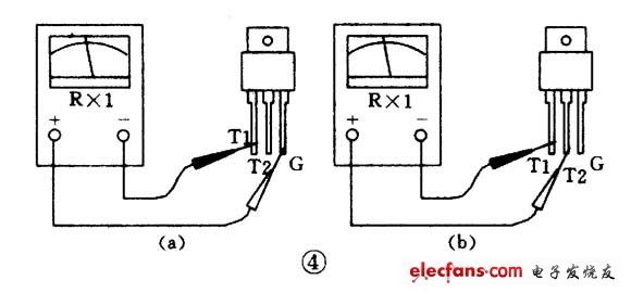 (2)把黑表笔接T1极,红表笔接T2极,电阻为无穷大。接着用红表笔尖把T2与G短路,给G极加上负触发信号,电阻值应为十欧左右(参见图4(a)),证明管子已经导通,导通方向为T1一T2。再将红表笔尖与G极脱开(但仍接T2),若电阻值保持不变,证明管子在触发之后能维持导通状态(见图4(b))。