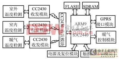 本系统硬件框图如图1 所示,主要由ARM9 控制器,温度检测模块,触摸屏显示模块,ZigBee 无线收发模块,暖气控制模块,GPRS 模块等组成。