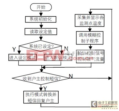 系统程序流程如图4 所示,系统应用程序主要由一系列用来实现相应功能的子程序组成,主要包括温度检测程序、ZigBee 无线通信程序、模糊控制程序、GPRS 无线通信程序等。