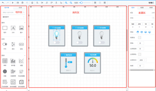 那么如何编辑组态呢?首先,组态编辑有三大可操控区域:组件区、画布区、配置区。