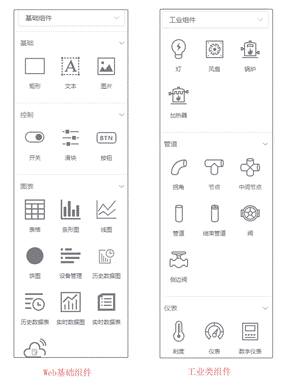 而组件又分为两类,一类是Web基础组件,是构建Web页面的基础元素;一类是工业组件,主要用于构建设备模拟运行场景。