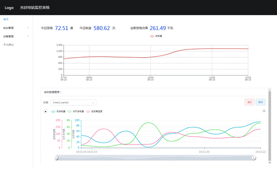 通过左侧导航、实时数据图表、文本框等组件,搭建了一个常规的光伏电站监控系统,可以查看光伏电站的发电情况。