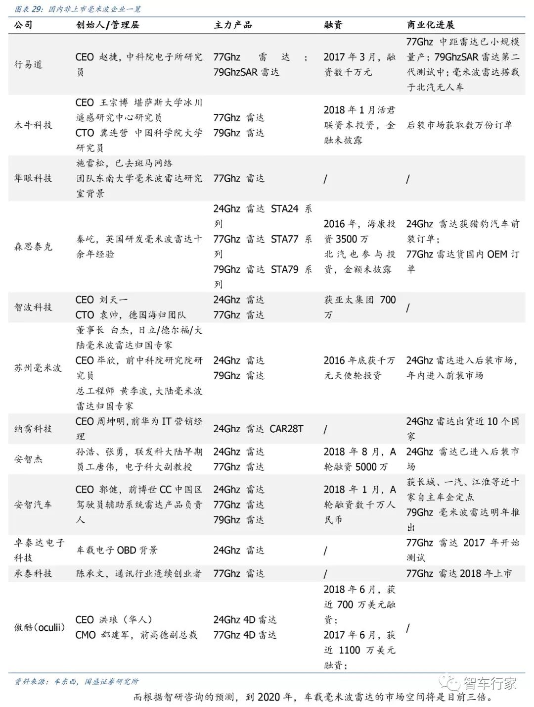 中国第一批做毫米波雷达的创业企业,大多都成立在 2014-2016 这几年,团队往往是科研背景、军工背景、或供应商跳槽创业背景。比如海归派:森思泰克、杭州智波。科研院所派:行易道、南京隼眼、苏州安智、苏州豪米波。实业转型派:深圳安智杰、深圳承泰、湖南纳雷。还有依莱达、木牛、雷博泰克、深圳卓颖。