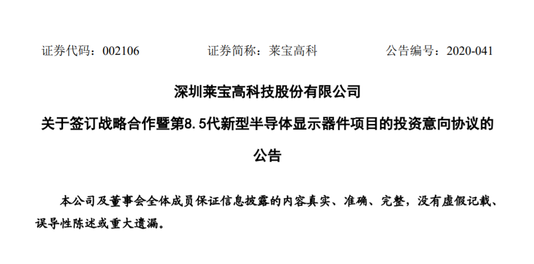 公告称,2020 年10月 29日,武汉东湖管委会与莱宝高科共同签署了《战略合作暨第 8.5 代新型半导体显示器件项目的投资意向协议》,共同合作投资建设第 8.5 代新型半导体显示器件项目。
