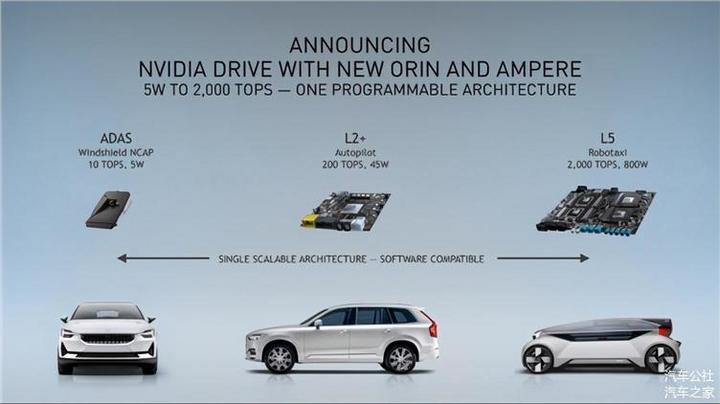 同时,在低功耗的基础上,其性能并没有妥协。Orin 的算力达到了200Tops,大幅领先特斯拉FSD 3.0的144Tops,而功耗只要后者的1/4不到。比起前代 Xavier,Orin的性能更是达到了6.7倍的进步。同时,Orin预计2022年后首发后,将率先搭载于奔驰、小鹏、理想等品牌车型上。