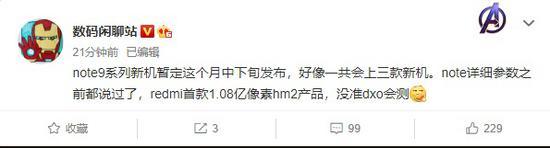 根据微博博主@数码闲聊站 消息,Redmi Note9系列新机暂定本月中下旬发布,一共会上三款新机。Redmi Note 9其中一款搭载1.08亿像素HM2相机产品。