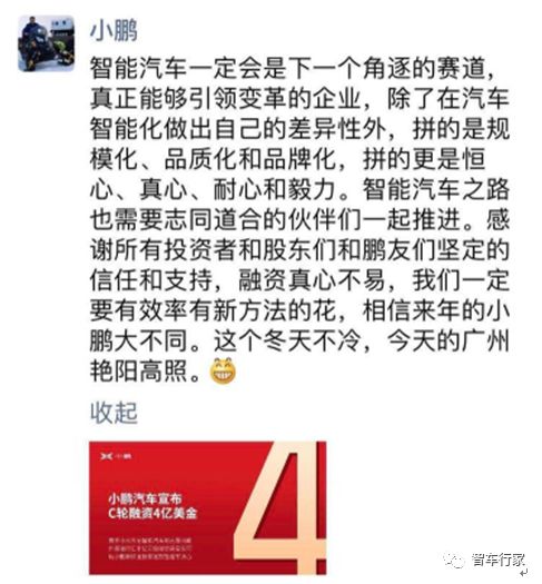智能汽车一定会是下一个角逐的赛道,真正能够引领变革的企业,除了在汽车智能化做出自己的差异性外,拼的是规模化、品质化和品牌化,拼的更是恒心、真心、耐心和毅力。 智能汽车之路也需要志同道合的伙伴们一起推进。感谢所有投资者和股东们和鹏友们坚定的信任和支持,融资真心不易,我们一定要有效率有新方法的地花,相信来年的小鹏大不同。这个冬天不冷,今天的广州艳阳高照。 希望鹏哥加油!