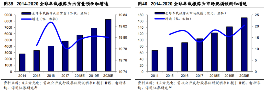 2014 年至 2020 年,车载摄像头全球出货量将由 2800 万枚增长至 8277 万枚,年复合增长率达 19.80%。
