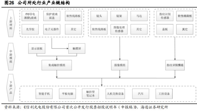 欧菲光相关终端产品的产业链大致分为上游材料、中游屏幕及模组、下游应用产品三个环节,公司主要生产制造的集成触控模组、触摸屏、微型摄像模组和指纹识别模组在行业产业链中处于中游链条。各环节生产制造技术特点各不相同。