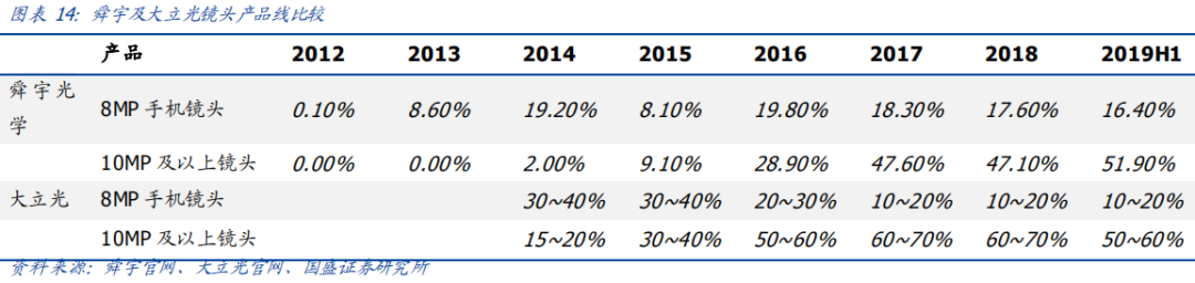 手机摄像模组出货量同比上升 37.6%,主要是因为产品结构的改善。2019 年上半年,舜宇光学零件业务毛利率 44.1%,同比增加 2 个百分点;2019 年上半年,10MP 像素以上手机镜头出货占比达到 51.9%。