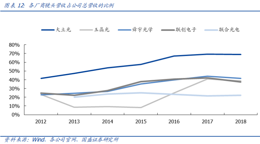 镜头是一个技术门槛较高的行业,行业格局集中度较高。从市场格局看,行业集中度较高,并且有进一步提升的趋势。各厂商镜头营收占公司总营收的比例:大立光 99%、玉晶光 95%、舜宇 18~22%、联创电子 15~20%、联合光电 98%。