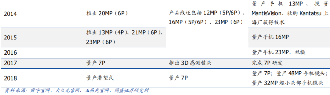 模组方面,公司自行研发的 MOB 和 MOC 技术,减少 AA 制程用量的同时缩小模组尺寸,降低成本的同时具有差异化竞争力能力。舜宇技术不断升级,与龙头厂商差距减小。舜宇在中高端智能手机份额逐渐增长,公司在 2018 年实现 48M 及 7P 镜头的量产,技术和产品规格,竞争力不断增强,与行业龙头厂商的差距逐渐减小。