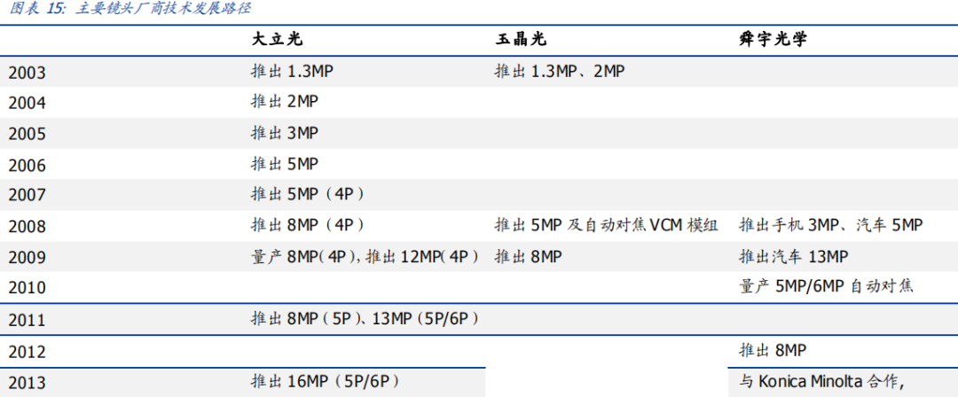 舜宇是国内光学龙头,乘光学升级而迅速成长。舜宇在消费电子高端模组及镜头具有龙头地位,在国内光学领域积累深厚。舜宇在 2004 年进入手机摄像头模组,同年开始研发车载镜头,2007 年开始出货。目前,舜宇的光学零件产品较为多元化,包括消费电子、汽车、安防、工业、化学、生命科学等。