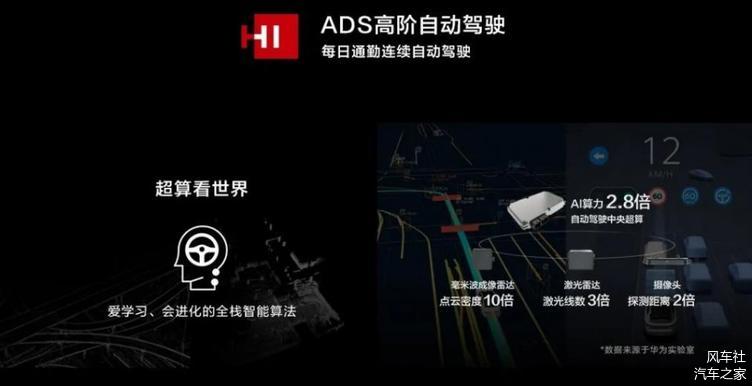 在智能驾驶方面,HI高阶自动驾驶ADS以L4级自动驾驶架构为基础,提供面向L4~L2+级自动驾驶全栈解决方案(包括传感器、中央超算、算法)。另外,其还有机器自我学习技术。