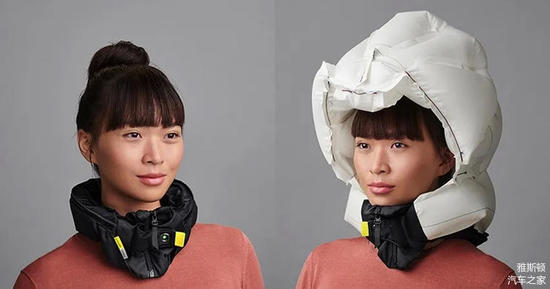 因为车内开始家居化和办公场景化,怎么安置更合适的安全气囊会是很大的课题。未来或许会出现下图这种「环抱式安全气囊」,它的优点是更加独立,不需要和车内其他部件产生协作也能保证安全。