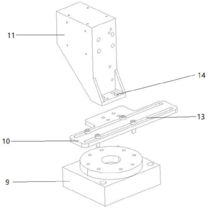 其中,支架11可以为利用自身底板安装的待测物4提供正交安装位,实现利用平板安装的待测物4测试时所需的正交姿态。横向平移台10可以通过横向长圆孔13内的螺钉与方位转向台9固定连接,如此以来,支架11和横向平移台10可以共同沿横向长圆孔13实现横向移动,直至待测物4的辐射口面几何中心与方位转向台9旋转中心重合。而方位转向台9受到电机控制,可以在水平面按照指令任意旋转,保证待测物4与射频收发模块6相对。