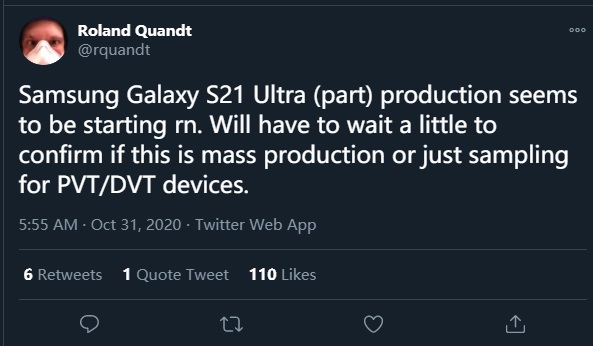 外媒 Sammobile 援引靠谱的爆料者 @Roland Quandt 爆料消息称,三星 Galaxy S21 Ultra 的部分生产工作现已开始。不过爆料者也表示不确定是否为大批量生产,不排除抽样生产的可能。