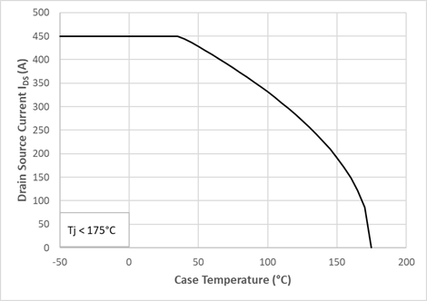 在Rjl(结到流体热阻)为 0.15°C/W,流速为10L/min(50%乙二醇,50%水),入口水温75°C的条件下,可以计算出最大连续漏极电流允许值与外壳温度之间的关系(基于最高结温时的导通电阻和最大工作结温来计算),如图3所示。