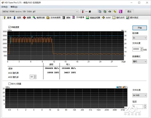 最后,在写入稳定性测试上,我们使用老牌存储软件HD Tune Pro,这是一款能够综合衡量存储产品性能的经典软件。此次的写入稳定性测试,我们将连续写入50GB左右数据量,模拟日常生活的实际操作,通过软件记录写入性能的变化曲线,以验证PC005 Active 1TB版本的写入逻辑和缓存机制,更真实展现PC005 Active 1TB版本的性能表现。