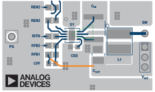 图2所示为ADP2360的示例布局。在本图中,图1中的重要热回路标为绿色。从图中可见,黄色反馈路径离线圈L1有一定距离。它位于PCB的内层。