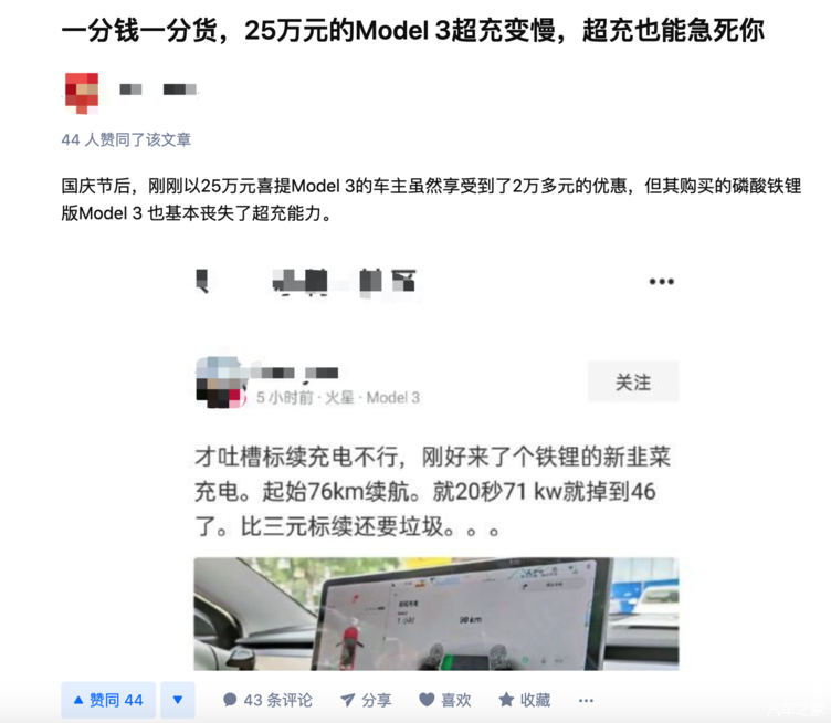 虽然这次降价幅度确实巨大,引起了市场很大的轰动,但随着磷酸铁锂电池版本的标准续航升级版提车用户越来越多,有不少用户在提到铁锂版本的 Model 3 充电速度较慢。