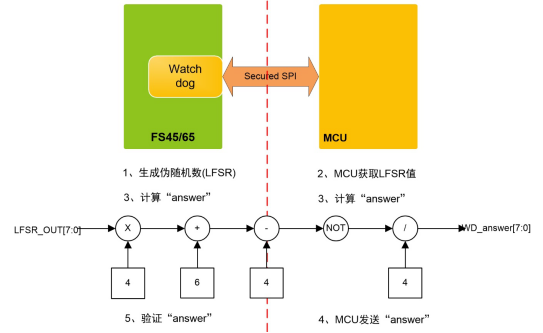 FS45/65 的看门狗是 Challenger WD,基于“question/answer”原理实现看门狗刷新:FS45/65 基于线性移位寄存器(LFSR)生成 8 位伪随机数,MCU 可以发送自定义 LFSR 的 seed 或使用 FS45/65 默认的 LFSR 值(0xB2),执行预定义的计算,通过 SPI 发送结果给 FS45/65 进行验证。验证正确,会产生新的伪随机数;验证错误,WD 错误计数器递增,WD_LFSR 的值不变,WD 错误计数器按照预定的配置,达到一定阈值,对 RSTB 和 FS0B 进行控制,从而使系统进入安全状态。