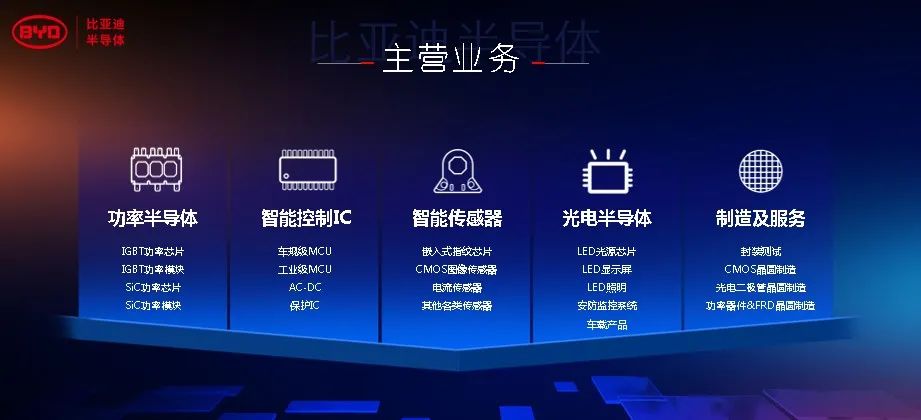 比亚迪半导体是国内领先的高效、智能、集成新型半导体企业,主要从事功率半导体,智能控制IC,智能传感器,光电半导体,制造及服务,应用领域覆盖了对光、电、磁等信号的感应、处理及控制,产品广泛用于汽车、能源、工业、通讯和消费电子等领域,具有广阔的市场前景。在技术快速发展、市场份额持续提升的同时,始终以高品质服务于国内外客户,为广大客户提供领先的车规级半导体整体解决方案。