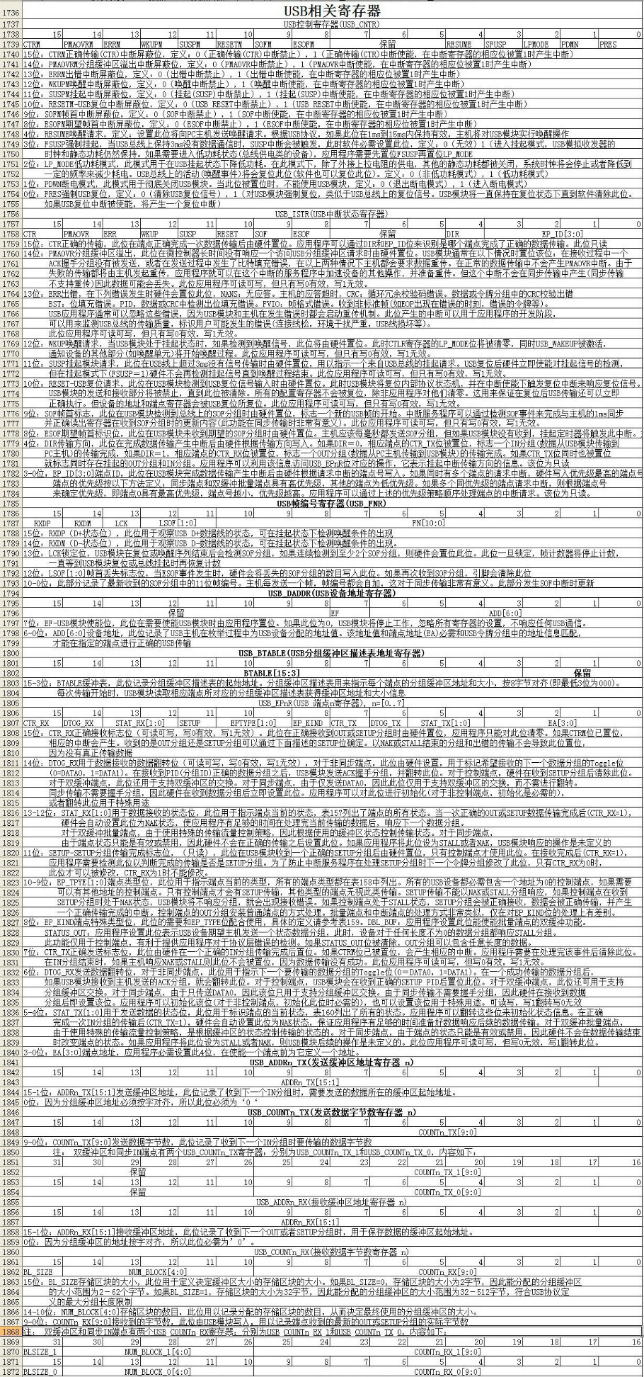 这里要贴上STM32 USB相关的寄存器的具体设置,对学习STM32的USB很有帮助。对于涉及到寄存部分的代码,参考这些寄存器的说明,就可以差不多都懂了。由于网页贴不上表格,所以就截屏成图片贴上来,如果看不清楚,就下载图片去看