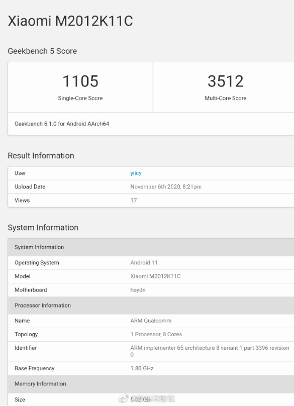 Geekbench 跑分显示,这款小米 M2012K11C 新机单核得分 1105,多核得分 3512,搭载 Android 11 操作系统。该机搭载高通 8 核处理器,CPU 基本频率为 1.80 GHz,应为骁龙 875 处理器,采用 “1+3+4”八核心设计。