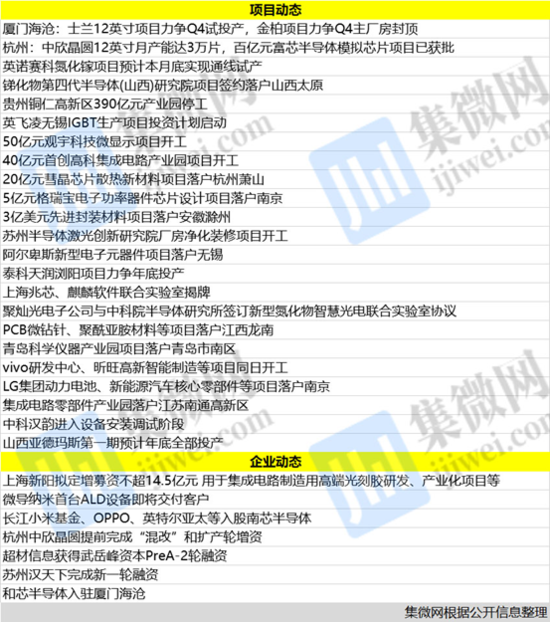本周,士兰12英寸项目力争于2020年第四季度试投产,英诺赛科氮化镓项目预计本月底实现通线试产,贵州铜仁高新区390亿元产业园停工,长江小米基金、OPPO、英特尔亚太等入股南芯半导体,微导纳米首台ALD设备即将交付客户……