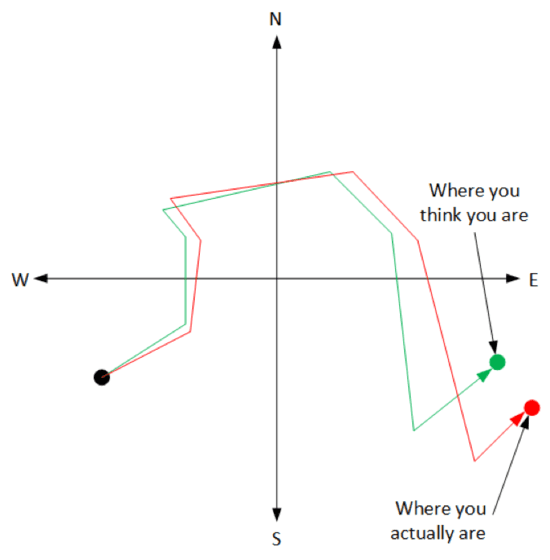 然而,挑战在于没有任何测量是没有错误的。每个测量位置都会有一定的误差,而下一个位置的测量也会有误差,并且该误差将加重第一个位置的误差。这些误差可能累积到实际位置可能与计算出的位置明显偏离的地步。
