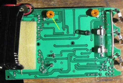 去年底我买了一块新出的ZT111万用表来玩,对比时发现这两个表测量1节5号电池的电压居然有明显的差值。相差几个字可以理解,多了就有问题了。一般来说新表更可信,于是我翻出来以前买的10V电压基准,把UT33-A校准一下看看。在这个万用表的PCB背面,有两个可变电阻,调VR1就是校准电压基准用的。