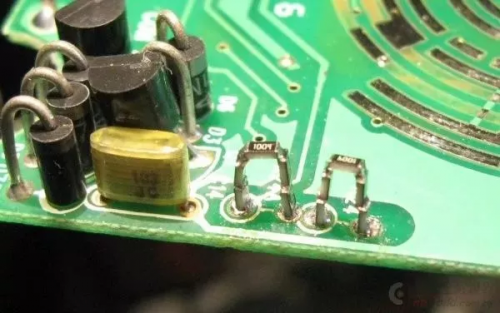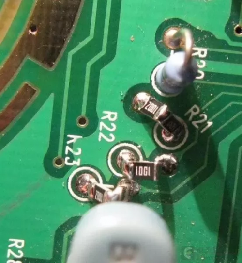 今儿动工把电阻换成了贴片精密电阻。我使用了“叠罗汉”法直接搭焊: