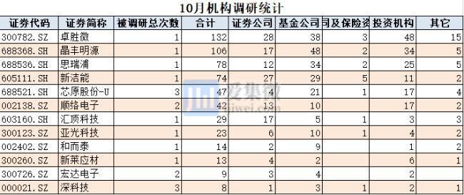 在二级市场的表现上,机构扎堆调研股中,10月股价上涨的有10只,占比超过8成,平均涨幅约6%(新洁能除外)。股价涨幅居前的公司有思瑞浦、卓胜微、顺络电子、宏达电子等,涨幅分别为15.98 %、14.81%、13.93%、11.24%;下跌的个股仅有2只,分别是芯原股份下跌7.85%、亚光科技下跌10.7%。