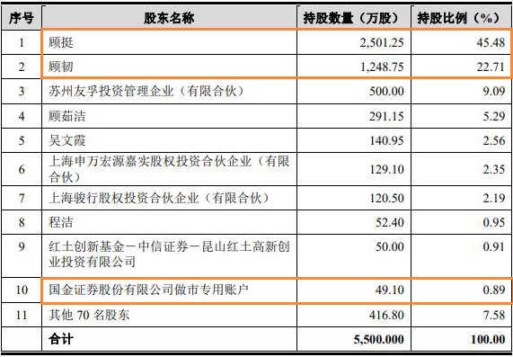 顾挺和顾韧系兄弟关系,分别直接持有公司45.48%和22.70%股权;友孚投资持有公司9.09%股权,系顾挺担任执行事务合伙人的有限合伙企业,顾挺和顾韧分别持有友孚投资34.30%和5.00%的出资份额。顾挺、顾韧直接持有公司68.18%的股份,并通过友孚投资合计控制公司77.27%的股份,为公司实际控制人。目前来看,兄弟两人合计持有公司股份比例近八成,倘若上市之后,在面临重大决策之时,公司如何保障投资者利益仍是一大难题。