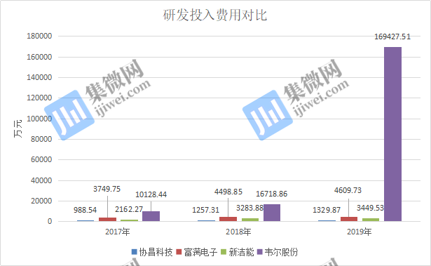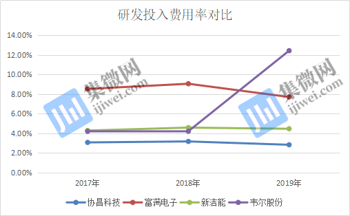 而在研发费用率方面,2017-2019年,新洁能的研发投入费用率分别为4.29%、4.59%、4.47%;富满电子的研发投入费用率分别为8.53%、9.06%、7.71%;韦尔股份的研发投入费用率分别为4.21%、4.22%、12.43%,可以明显看出,这三家的研发费用率均高于协昌科技。