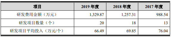 通过对比,协昌科技无论的研发投入金额还是研发费用率均不如同行公司,而在研发项目平均投入方面也出现下降趋势。2017—2019年,协昌科技单个研发项目平均投入金额分别为76.04万元、69.85万元和66.49万元,单个项目平均投入呈现逐年降低。