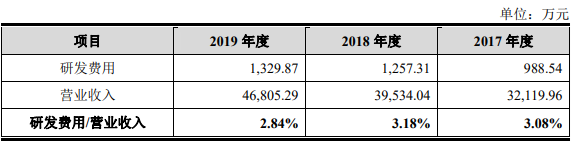 2017—2019年,协昌科技研发费用分别为988.54万元、1257.31万元和1329.87万元,研发费用率分别为3.08%、3.18%和2.84%,2019年研发费用率较2018年下滑0.34%。