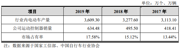 近三年,协昌科技运动控制器分别达到418.41万台、495.50万台和634.48万台。而行业内电动车产量分别为3113.10万辆、3277.60万辆、3609.30万辆,其市场占有率分别为13.44%、15.12%、17.58%。