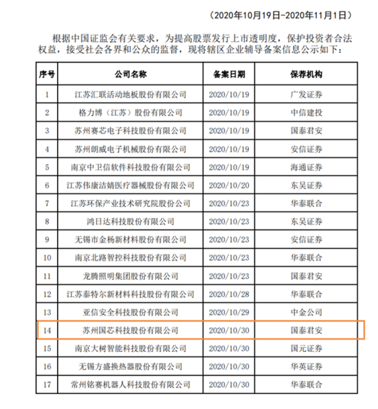 近日,江苏证监局披露了10月19日-11月1日期间江苏辖区企业辅导备案信息。根据披露的内容,苏州国芯科技股份有限公司(下称“苏州国芯”)已于今年10月30日进行上市辅导备案。